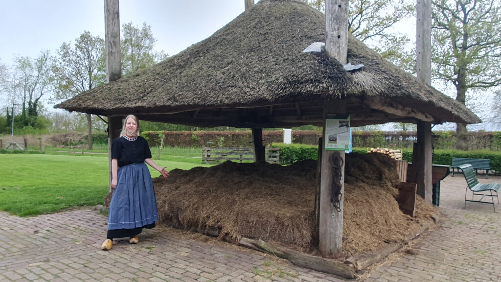 Hier zien we een zgn. vierroeder hooiberg. Het woord vierroeder slaat op de vier palen (roedes) waaraan de kap is opgehangen. Deze werd gebruikt voor de opslag van hooi.