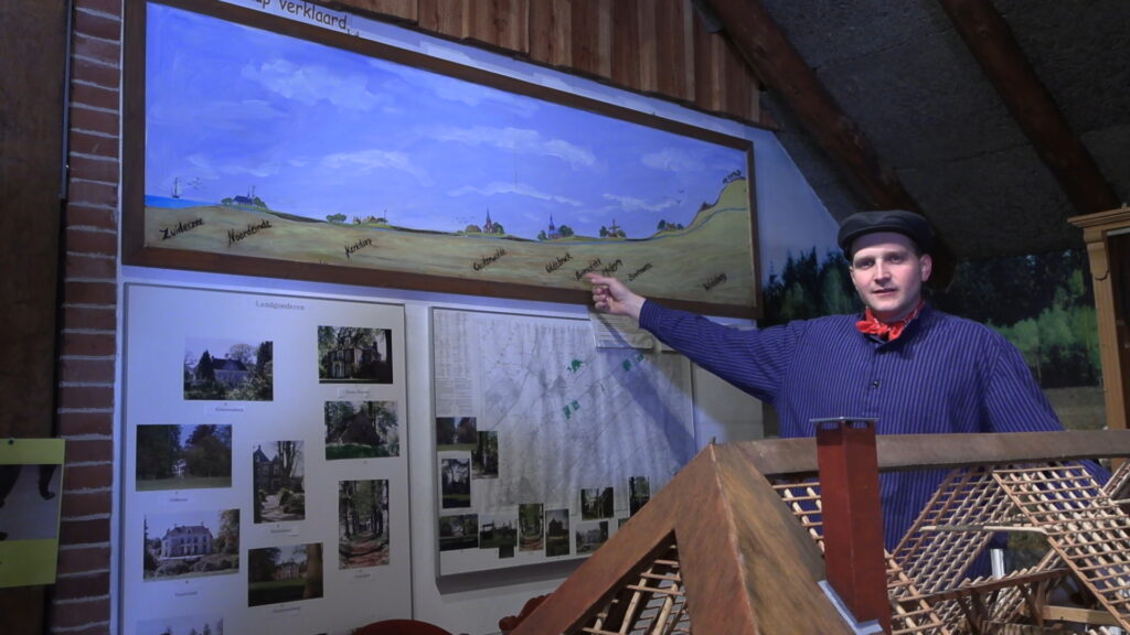 Op de wand links van de maquette ziet u een afbeelding met daarop een overzicht van de hoogteverschillen tussen de Veluwse heuvels en de voormalige Zuiderzee, nu het Drontermeer. Met een blauwe lijn is de stand van het grondwater aangegeven. U ziet dat het hier en daar aan de oppervlakte komt, wat eeuwenlang veenvorming veroorzaakte, zoals op het lage land, maar hier en daar ook in hoge delen, zoals in het Bovenveen. In de vitrines ziet u foto’s van het in de loop der jaren ontstane landschap met o.a.: